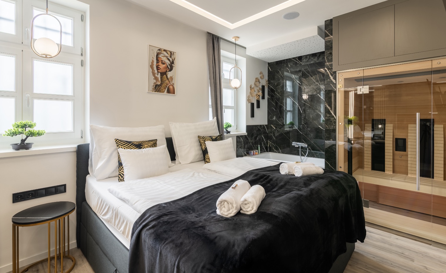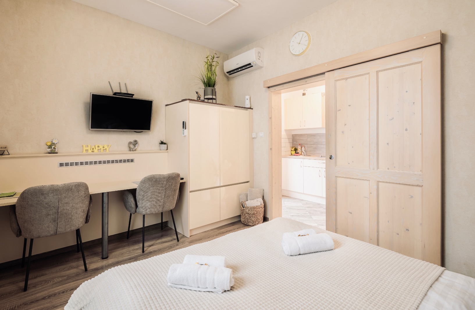 A Bliss apartman a könnyedség és a derű otthona. Világos színei, természetes anyagai és barátságos terei teszik otthonossá.